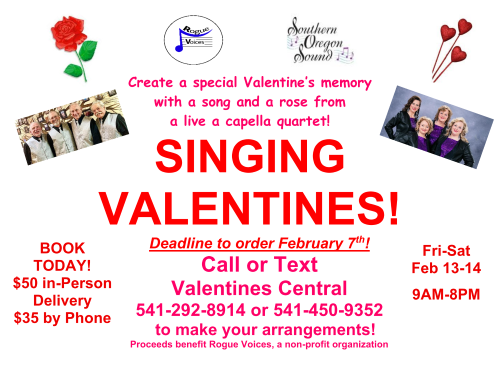 For more information, contact Pam at 541-560-1172 or Mona at 541-840-5034. Or you can send an email to info@southernoregonsoundchorus.com.
