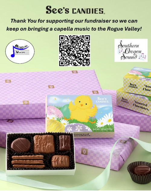 Rogue Voices and Southern Oregon Sound have a Sweet Deal for you! We're having a See's Candy Fundraiser. Just go to https://www.yumraising.com/store/spring-2026-rogue-voices-southern-oregon-sound-chorus-b7ed/PamLee2651 or scan the QR code below to go to our Storefront and place your orders. LAST DATE TO ORDER IS MARCH 20TH! Your order will be shipped in time for Easter but sooner works too as a Spring Surprise for that special someone. There's always room for chocolate!